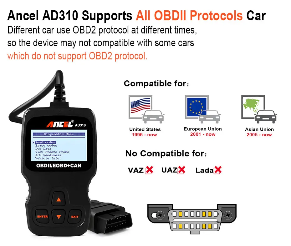 AD310 Supported Protocol: ISO 9141-2 , ISO14230-4 KWP , ISO15765-4 CAN