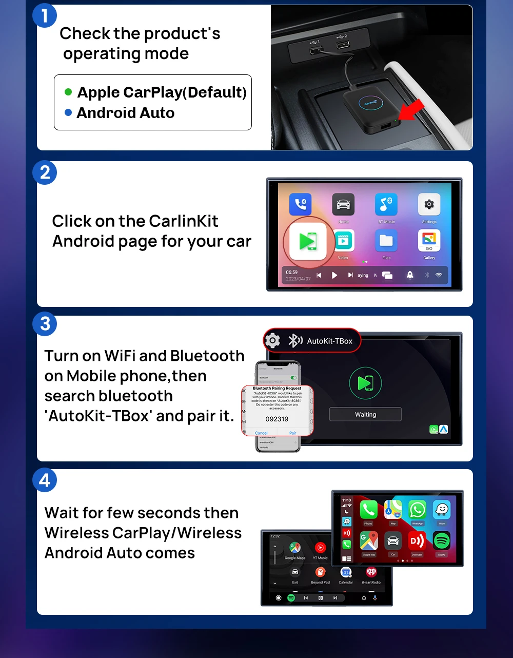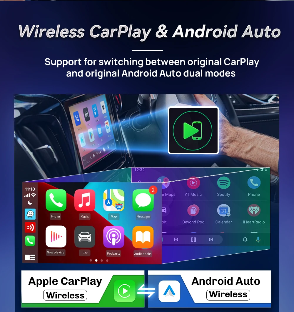 Feature 1: Wireless CarPlay, Wireless Android auto, for youtube, netflix, Iptv, play store etc.
