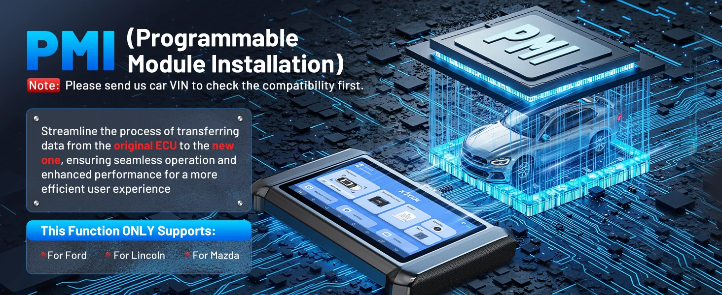 O scanner de diagnóstico automotivo XTOOL D7S suporta a função PMI (instalação de módulo programável) da Ford/Lincoln/Mazda, permitindo transferência de dados perfeita da ECU original para um módulo novo ou usado para desempenho aprimorado e programação simplificada.Além disso, fornece orientação de reparo e solução de problemas passo a passo, incluindo funções de teste ativos, especificamente adaptadas para veículos V.A.G (para VW/Audi/Skoda), garantindo uma experiência de diagnóstico eficiente e fácil de usar.