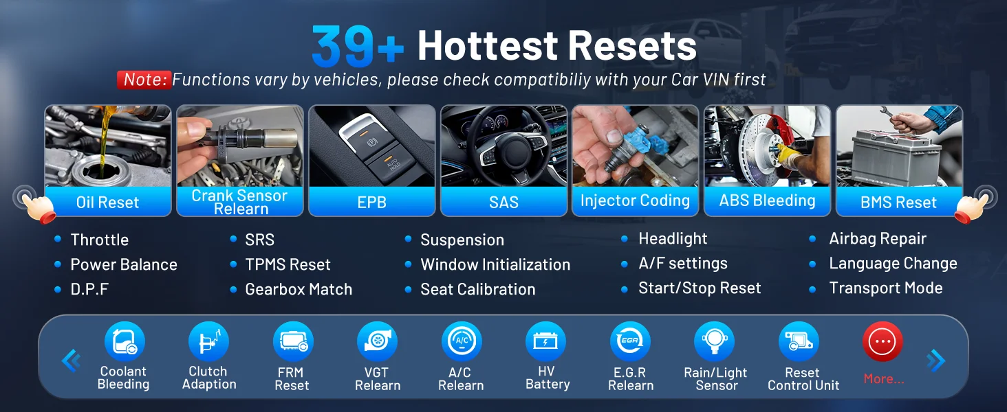 Unidade de controle de reinicialização, sensor de chuva/luz, reaprendizado de A/C, bateria HV, reaprendizado VGT, redefinição de FRM, reaprendizado de EGR, SRS, adaptação de embreagem, limite de velocidade, ativação eletrônica da bomba de água, redefinição de luz de manutenção/manutenção, redefinição de EPB, ajuste SAS, regeneração DPF, codificação de injetores, sangramento ABS, aprendizado de engrenagens, reinicialização de caixa de engrenagens,....